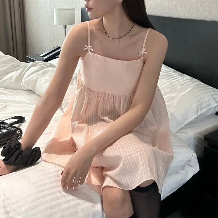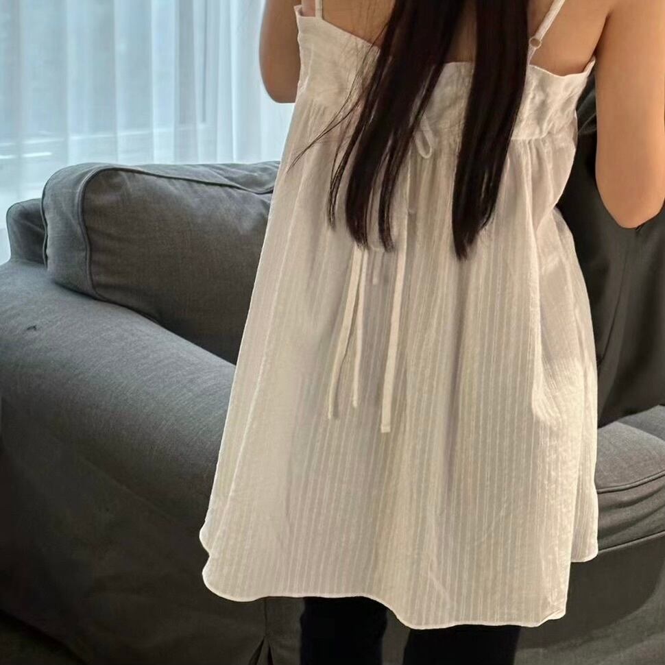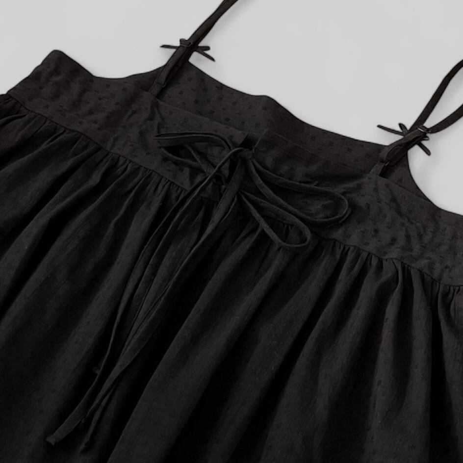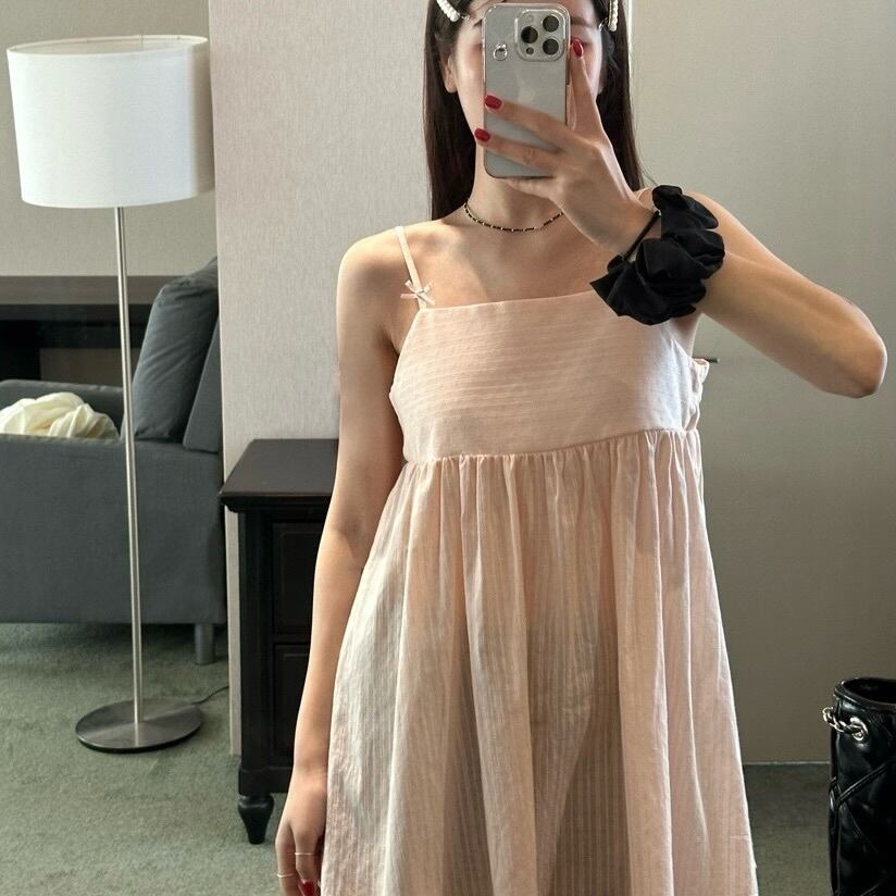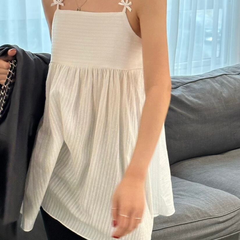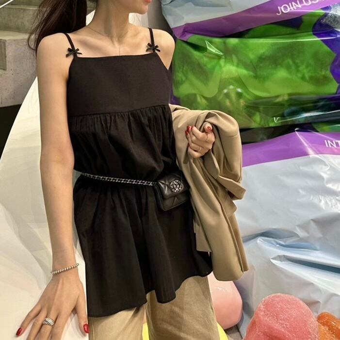 可憐なリボンが肩に施されたデザインが、シンプルながらも華やかさを演出。1枚でワンピースとして着用したり、様々なボトムスと組み合わせもしやすく、カジュアルなコーディネートから少しおしゃれしたい時まで幅広く活躍できる一着です!